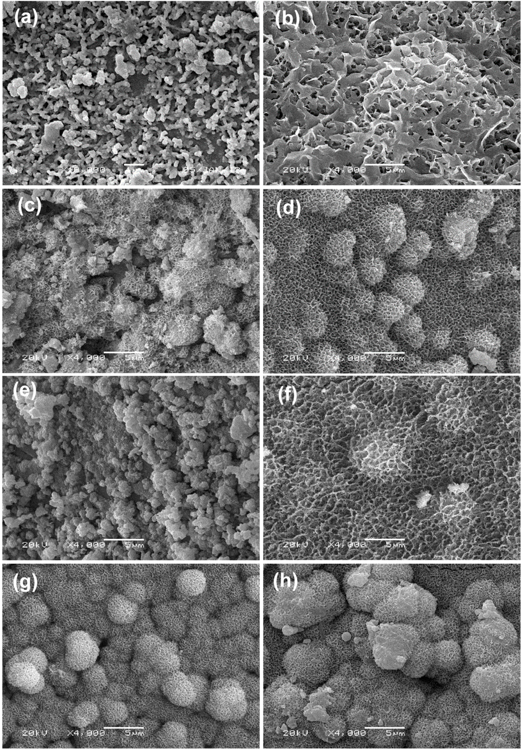 SEM images of the scaffolds after immersion in simulated body fluid (SBF) for 2 weeks and 4 weeks: (a,b) β-TCP; (c,d) β-TCP/SiO2; (e,f) β-TCP/MgO and (g,h) β-TCP/SiO2/MgO. 2 weeks: (a,c,e,g); 4 weeks: (b,d,f,h).