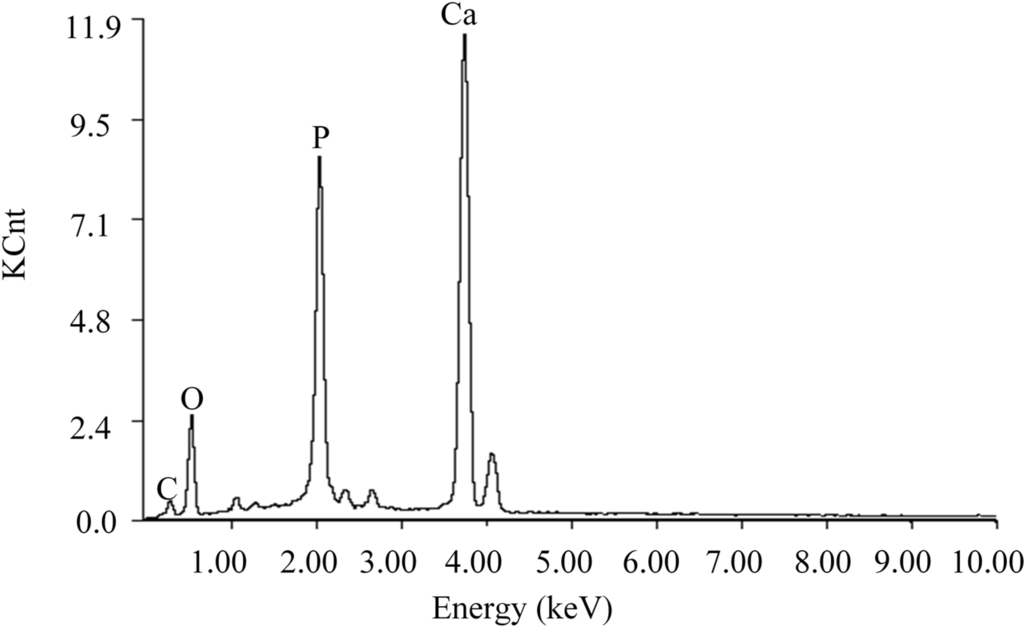 The mineral layers on the scaffold surface were confirmed by EDS analysis (Figure 5). This demonstrated that the mineral layer was mainly composed of calcium, phosphorus and oxygen with a Ca/P mole ratio of 1.675. The Ca/P mole ratio of mineral component was similar to hydroxy-carbonate apatite (HCA) (Ca/P mole ratio: 1.67).