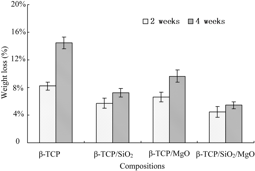 The scaffolds underwent both apatite layer formation and degradation processes in SBF. The weight change percent of scaffolds in SBF after 2 and 4 weeks were shown in Figure 6. The β-TCP scaffold had the highest degradation rate with weight loss of 8.19 ± 0.56 wt % after 2 weeks and 14.46 ± 0.82 wt % after 4 weeks. Compared with β-TCP scaffold, the composite scaffolds (β-TCP/SiO2, β-TCP/MgO and β-TCP/SiO2/MgO) displayed lower degradation rates. The weight losses were 5.70 ± 0.72 wt %, 6.62 ± 0.68 wt %, and 4.43 ± 0.76 wt % respectively after 2 weeks. And β-TCP/SiO2/MgO showed the lowest weight loss of 5.44 ± 0.52 wt % (4 weeks). The weight loss results demonstrated that the degradation dominated over apatite formation for all scaffolds. Nevertheless, the addition of SiO2 and MgO slowed down the degradation of β-TCP scaffolds. This was because Si and Mg increased the mineralization rate in SBF. Si and Mg acted as nucleation or created a favorable condition for apatite formation and at the same time slowed down the dissolution process in vitro []. Weight loss of β-TCP/SiO2/MgO scaffold was significantly lower than that of β-TCP scaffold. As Ca ions were released to the solution, hydrogen ions formed a hydrated silica leaching layer containing Si–OH groups on the scaffold surface, which acted as a catalyzing agent for the nucleation and growth of bone-like apatite layer. Li et al. found that SiO2 can form a Si–OH functional layer easily in vitro and thereby enhance the mineralization of apatite-like phase. It was believed that the fast formation of bone-like layer on the surfaces of these scaffolds was closely related to the increasingly provided silanol groups [].
