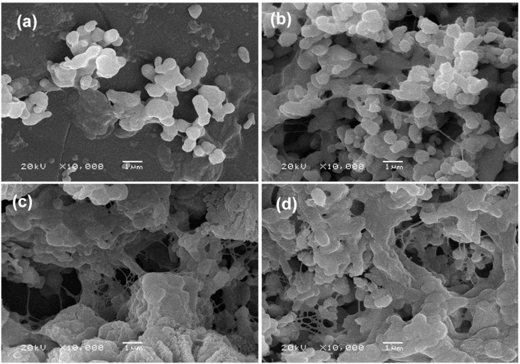 SEM morphology of MG-63 cells on the scaffolds for 7 days. (a) β-TCP; (b) β-TCP/SiO2; (c) β-TCP/MgO; and (d) β-TCP/SiO2/MgO.