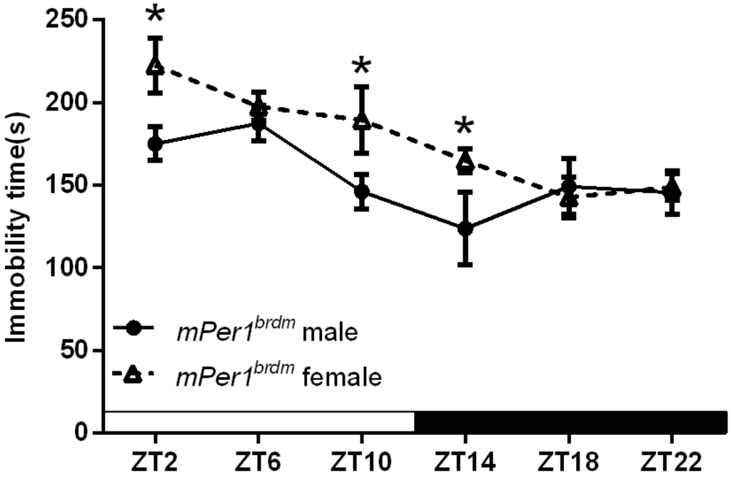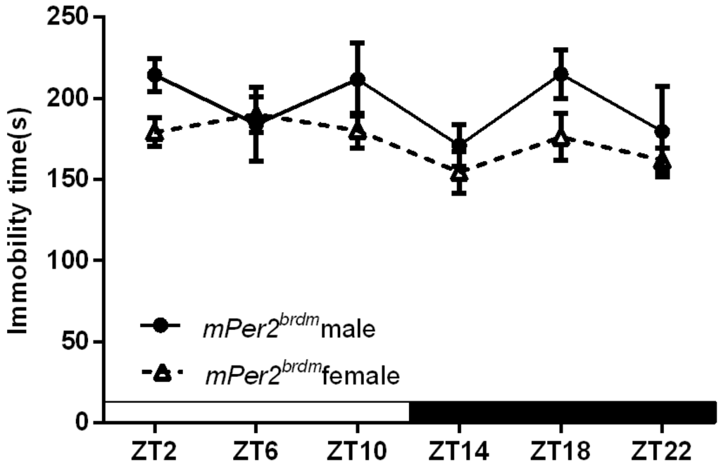 Anxiety and depression occur more frequently in females than in males in the human population [], indicating the existence of sex-specific differences in the mechanisms of depression. Most importantly, sex hormones affect many aspects of circadian responses, and there are significant sex-specific differences in rhythmicity []. Here, we show that WT mice display diurnal rhythms of immobility with a sex-specific pattern. This implies that male–female differences also exist in the interaction of environmental factors and internal circadian rhythmicity. Furthermore, Per1Brdm1 mice showed circadian rhythms of immobility, but no sex-specific differences were observed. Our results implied that mPer1 regulates the rhythmicity of immobility in a sex-specific pattern.