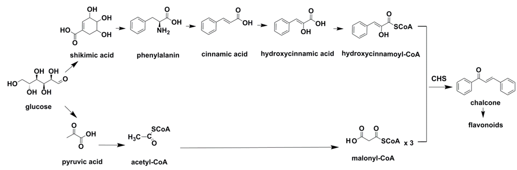 Relevant studies showed that both synthetic pathways were derived from glucose metabolism. In addition, the two main precursors could be joined by a condensation reaction catalyzed by chalcone synthase (CHS) to be converted into flavonoids, which are the most abundant and important group of polyphenol compounds [26,27]. Therefore, another classification system could be established according to the flavonoid or non-flavonoid structures of the aforementioned compounds.