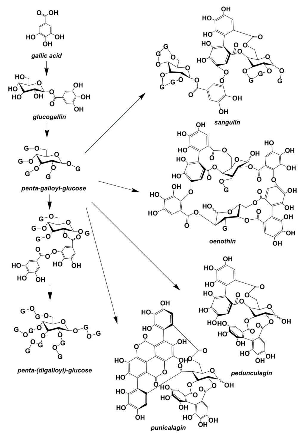Polyphenolic compounds found in oak wood have important functions in aged wines. Not only do oak polyphenols have an essential role in wine maturation but also feature as influencing factors associated with potent antioxidant effects [40]. These compounds are normally classified into three main classes: volatile phenols, phenolic acids and ellagitannins. In structure, both volatile phenols and phenolic acids are derived from the simple phenol structure of hydroxybenzene, which is an aromatic ring, whereas ellagitannins are a diverse class of hydrolyzable tannins, a type of polyphenol formed primarily from the oxidative linkage of galloyl groups in β-1,2,3,4,6-pentagalloyl glucose.