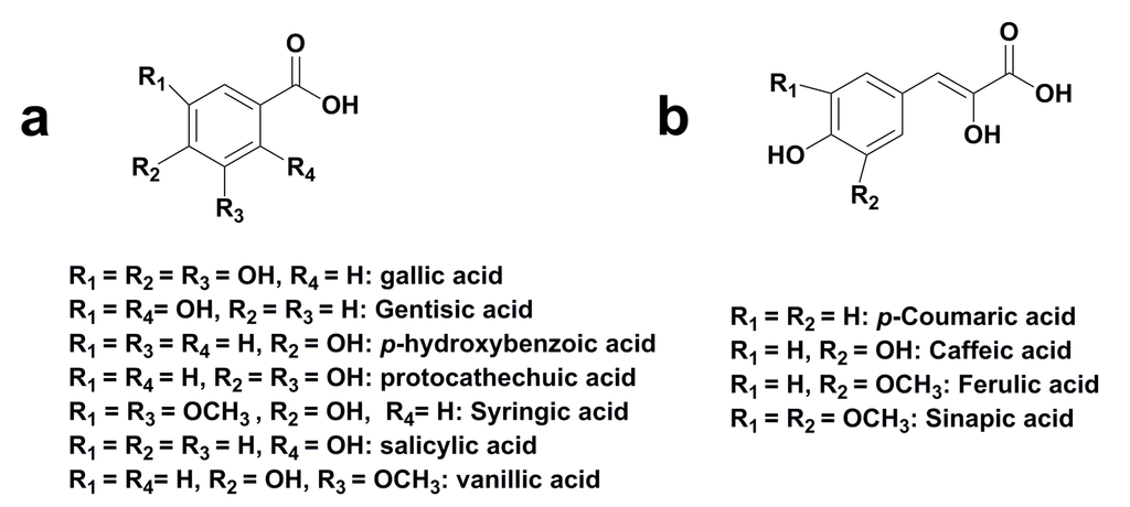 The non-flavonoid phenolic constituents in plants can be mainly classified into hydroxybenzoic acids, hydroxycinnamic acids, volatile phenols, stilbenes, and miscellaneous compounds (e.g., lignans and coumarins) [33,34]. Hydroxybenzoic acids are organic compounds that contain a phenolic ring and an associated carboxylic group, making a C6-C1 structure. The most common derivatives of hydroxybenzoic acid found in plants are gallic, vanillic, p-hydroxybenzoic, syringic, and protocatechuic acids [33]. Hydroxycinnamic acids, which were widely distributed in plant-originated food products, are a class of polyphenols with a C6-C3 skeleton, and exist either in free form or associated with other components, such as quinic acid or polysaccharides [35,36]. Furthermore, volatile phenols possess aroma characteristics, and stilbenes can act as phytoalexins, which also contribute to flavor and potent biological activities for plants, respectively.