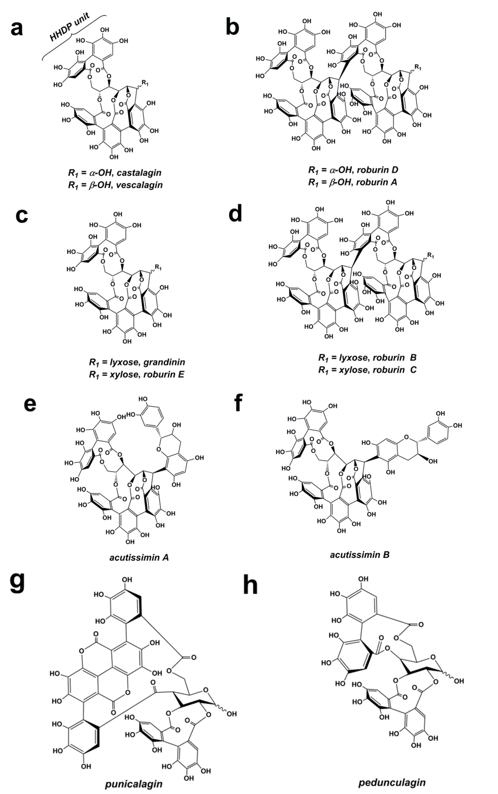 - Viriot, C.; Scalbert, A.; Hervé du Penhoat, C.L.M.; Moutounet, M. Ellagitannins in woods of sessile oak and sweet chestnut dimerization and hydrolysis during wood ageing. Phytochemistry 1994, 36, 1253–1260. [Google Scholar] [CrossRef]