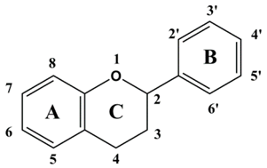 Flavonoid chemical skeletons are based on C15 (C6-C3-C6) compounds, all of which share a common diphenyl propane structure with two aromatic rings (ring A and B) joined through a group of three carbon atoms to yield an oxygenated heterocycle (ring C). Flavonoids also occasionally occur in plants as O- or C-glycosides. The preferred glycosylation sites of these compounds are the C3 position of the C ring, or C5 position of the A ring, and less frequently, the C7 site of flavonoid structures. Glucose is the most common sugar residue of flavonoids, but others include rhamnose, xylose, and galactose [28,29,30]. Based on experimental determination, the arrangement of C3 group determines their classification. Normally, flavonoids consist mainly of monomeric flavanols (catechins and leucoanthocyanidins), polymeric flavanols (proanthocyanidins), and chalcones, flavonols, flavanones, and anthocyanidins, which were all biosynthesized in the flavonoid pathway. Besides, isoflavonoids, biflavonoids, and neoflavanoids were also studied [31,32]. Table 2 gives the basic chemical structures of the main flavonoid compounds.