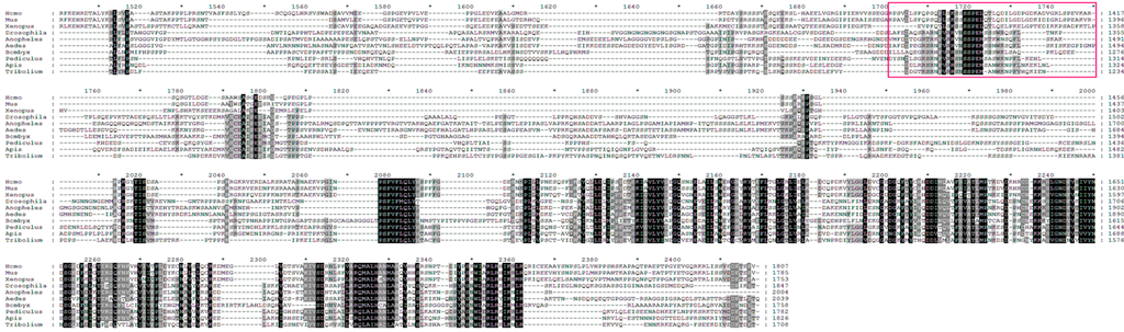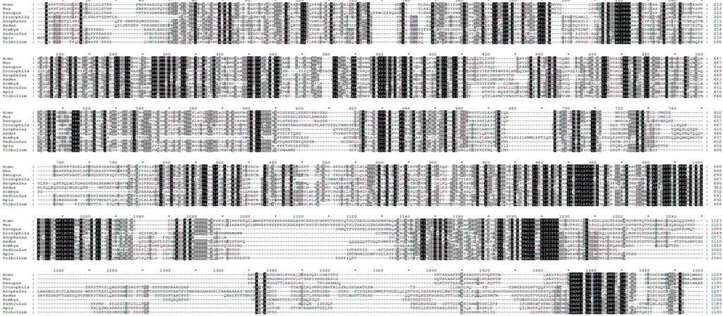 Multiple sequence alignment of tuberous sclerosis complex 2 (TSC2)-like proteins from different vertebrate and invertebrate species. Sequence alignment was conducted using CLUSTALW using TSC2 from the following animal species (from top to bottom): Homo sapiens, Mus musculus, Xenopus tropicalis, Drosophila melanogaster, Anopheles gambiae, Aedes aegypti, Bombyx mori, Pediculus humanus corporis, Apis mellifera, Tribolium castaneum. Pairwise alignment parameters are: Gap Open Penalty: 10.0, Gap Extension Penalty: 0.1, Weight Matrix: BLOSUM. Multiple alignment parameters are: Gap Open Penalty: 10.0, Gap Extension Penalty: 0.05, Weight Transition: YES (Value: 0.5), Hydrophilic Gaps: YES, Weight Matrix: ID (identity matrix). The alignment was constructed at GenomeNet (Kyoto University Bioinformatics Center) and rendered in GeneDoc v.2.7. Numbers and stars (*) above the sequences mark every 10 amino acids (a.a.). Residues were shaded according to their conservation between the examined species (black, 100%; dark grey, 80–99%; light grey, 60–79%). Red box highlights the conserved AMPK phosphorylation site, which is analyzed in more detail in Figure 3.