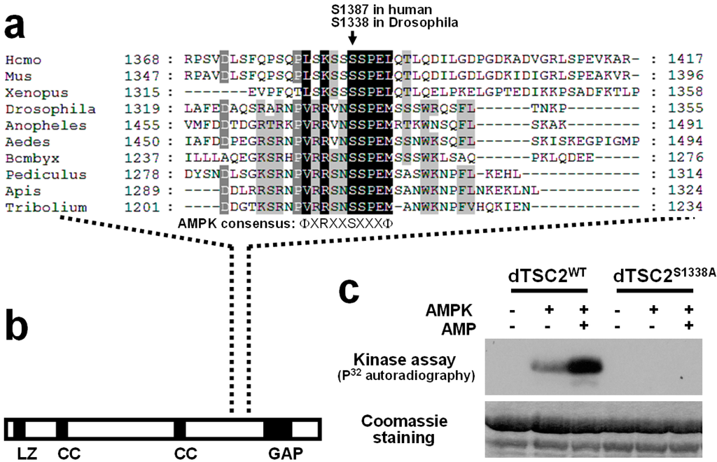 Conservation of AMPK phosphorylation site in Drosophila TSC2. (a) Multiple sequence alignment of TSC2-like proteins. A region surrounding the AMPK phosphorylation site (Ser1387 in human TSC2; highlighted in Figure 2 with red box) was magnified here. a.a. residues were shaded as in Figure 2; (b) Domain structure of Drosophila TSC2. The AMPK phosphorylation site falls between coiled coil (CC) and GAP domains; (c) In vitro kinase assay using purified AMPK protein and recombinant wild-type or Ser1338Ala-mutated Drosophila TSC2 protein corresponding to a.a. 1278-1371.