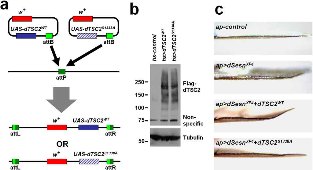 Ser1338 is required for genetic interaction between Drosophila TSC2 and Sestrin. (a) Schematic representation of how Drosophila TSC2 transgenic flies were made. Plasmid which can express wild-type or Ser1338Ala-mutated Drosophila TSC2 was inserted into an identical genomic location (the attP site) through phiC31-mediated recombination; (b) Heat shock (hs) Gal4-mediated induction of Drosophila TSC2 proteins. Adult flies of indicated genotypes were incubated overnight at 30 °C and subjected to immunoblot analysis of indicated proteins. Molecular weight markers are in kDa; (c) Wing blades of the flies expressing indicated transgenic elements were imaged under a light dissection microscope. dSesnXP4 is an EP allele of dSesn that can drive tissue-specific Sestrin overexpression [].