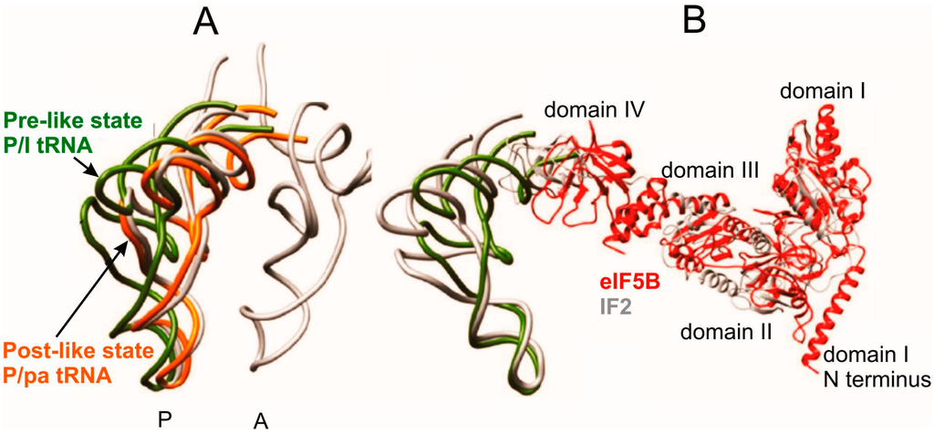 Comparison of tRNA positioning in the Pre-like and Post-like states of the 80S initiation complex with that in classical A and P sites []. (A) configurations of P/I-tRNA in the Pre-like state (green), P/pa-tRNA in the Post-like-state (orange) and classical A/A-tRNA and P/P-tRNA (gray); (B) comparison of the positioning of Met-tRNAiMet and eIF5B (red) within the mammalian Pre-like state and that of IF2 and fMet-tRNAfMet within the bacterial initiation complex (gray).