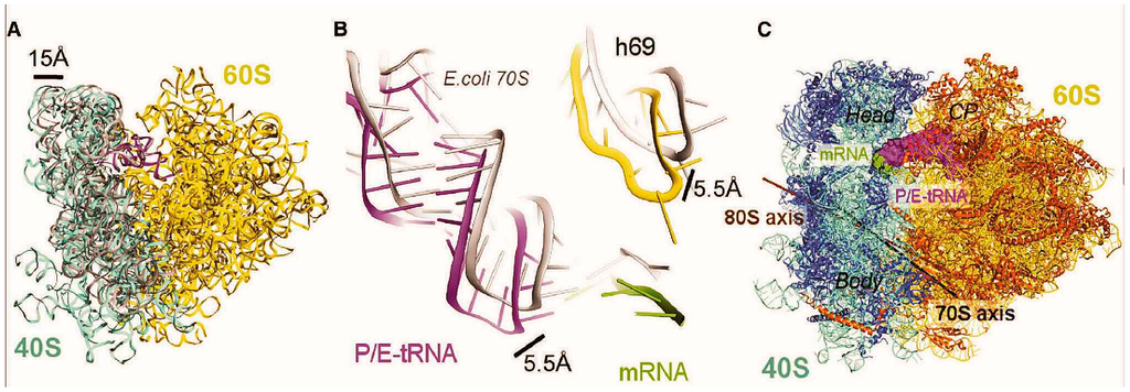 Differences in the conformations of rotated yeast 80S and bacterial 70S ribosomes in the complex with P/E-site tRNA []. (A) The tilt of the small 40S subunit relative to the large 60S subunit resulting in the shift of the head of the small subunit away from the core of the 60S subunit by up to 15 Å. 18S and 25S rRNAs in the rotated yeast ribosome are shown in blue and yellow, respectively; E. coli 16S rRNA of the 30S subunit in the analogous bacterial complex is shown in gray; (B) Differences in positions of the tRNA, mRNA, and helix 69 between the rotated yeast and E. coli ribosomes. Components of the bacterial complex are presented in gray; (C) Intersubunit rotation axes for yeast (brown) and E. coli (black) ribosomes (CP, central protuberance of the large subunit).