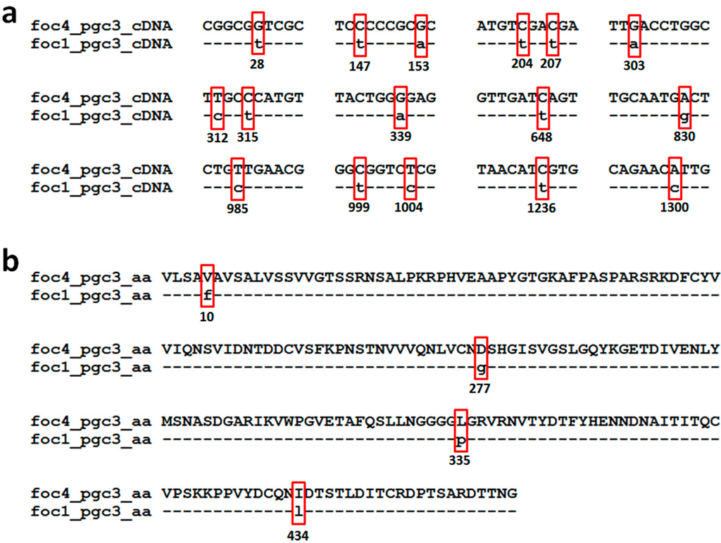 Pairwise sequence alignment of the nucleotide sequences (open reading frame, ORF) and predicted proteins of pgc3 from FOC1 and FOC4. (a) Alignment of ORF of pgc3 from FOC1 and FOC4; (b) alignment of predicted proteins of pgc3 from FOC1 and FOC4.