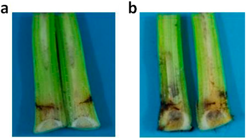 Tissue necrosis analysis of Cavendish banana stem. (a) Plants injected with r-FOC1-PGC3; (b) Plants injected with r-FOC4-PGC3. Each plant was injected with 1 U of enzyme. Each treatment was cut for observing vascular necrosis after five days.