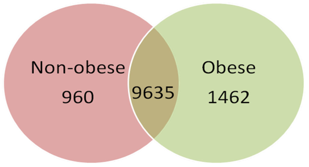Venn diagram of the expressed sequences in the visceral adipose tissue of obese and normal-weight prepubertal children. After filtering the data with the Affymetrix Detection Algorithm, a total of 12,057 sequences were found to be expressed in adipose tissue. Each condition is represented by a circle in the Venn diagram. The numbers in the region of the overlapping circles indicate the genes that are expressed in both conditions.