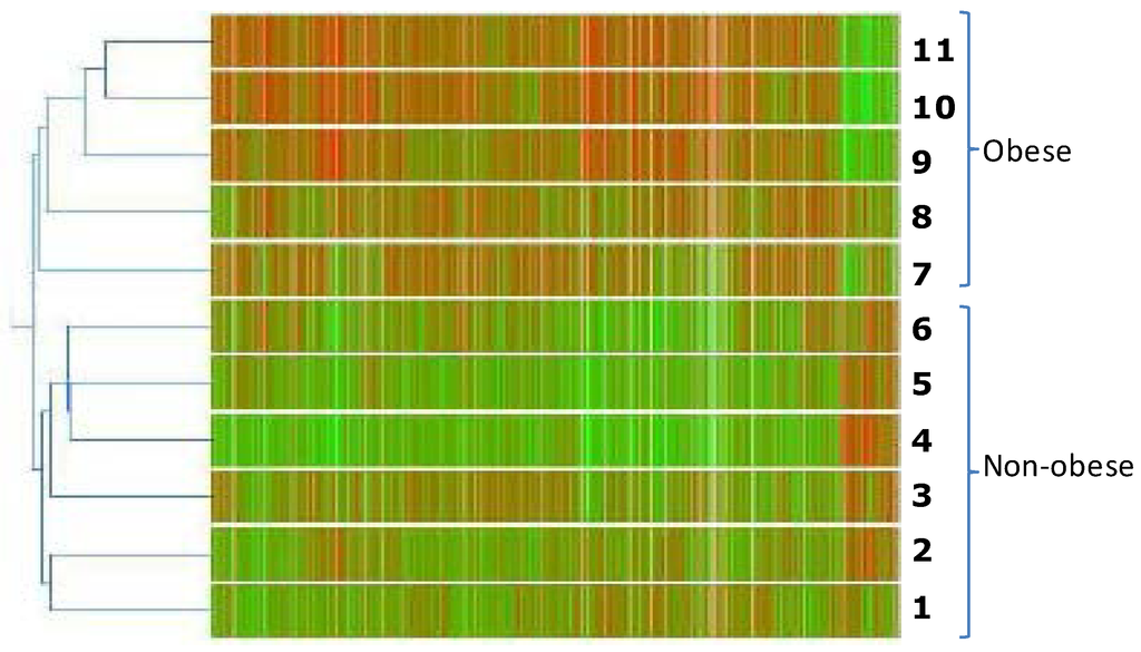 Microarray analysis of the transcripts expressed in the visceral adipose tissue from obese vs. normal-weight (control) prepubertal children. RNA from each patient was subjected to chip analysis using Affymetrix Human Genome U133Plus 2.0 GeneChips. The normal-weight group consists of six individuals (numbers 1–6), and the obese group consists of five patients (numbers 7–11). Bidimensional cluster analysis was performed using a Pearson correlation. The parametric test ANOVA was used to uncover the 1588 genes that were differentially expressed.