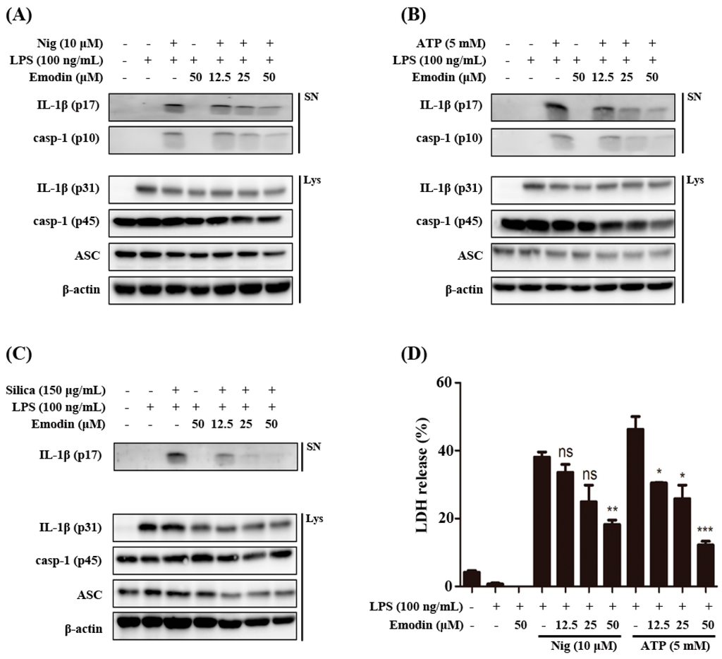Effects of emodin on inflammasome-induced interleukin (IL)-1β secretion and cell death in vitro. LPS-primed bone marrow-derived macrophages (BMDMs) were pretreated with emodin for 1 h and stimulated with (A) nigericin (Nig) (10 μM) and (B) ATP (5 mM) for 1 h, and (C) silica crystals (silica) (150 μg/mL) for 3 h, and supernatants (SN) were used to detect cleaved IL-1β (p17) and caspase-1 (p10). Cell lysates (Lys) were used to detect internal controls, such as pro-IL-1β (p31), ASC, pro-caspase-1 (p45), and β-actin; (D) LPS-primed BMDMs were treated with emodin at the indicated concentration for 1 h and then treated with nigericin (Nig) (10 μM) and ATP (5 mM) for 1 h, after which supernatants were collected for LDH determination. The results are expressed as mean ± S.E.M. of three independent experiments in triplicate. * p < 0.05, ** p < 0.01 and *** p < 0.001 compared with Nig, ATP treated cells. ns: None significant.