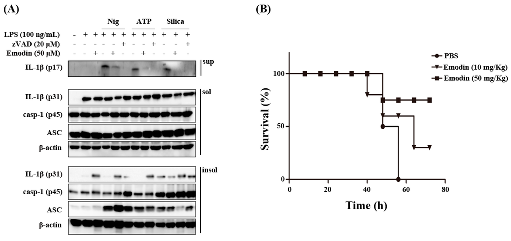 LPS-induced endotoxin shock is reduced in NLRP3 gene-deleted mice compared to intact mice [22]. Thus, we confirmed the inhibitory effect of emodin on NLRP3 inflammasome activation by the LPS-induced endotoxin shock model. As shown in Figure 2B, mice intra peritoneally treated with emodin showed higher survival rates than LPS alone injected control mice, indicating that emodin can ameliorate the severity of NLRP3 inflammasome-mediated disease symptoms in vivo.