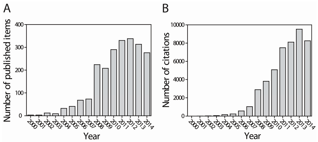 Scientometric analysis of the research on H2 production. Published items (A) and citations (B) in each year.