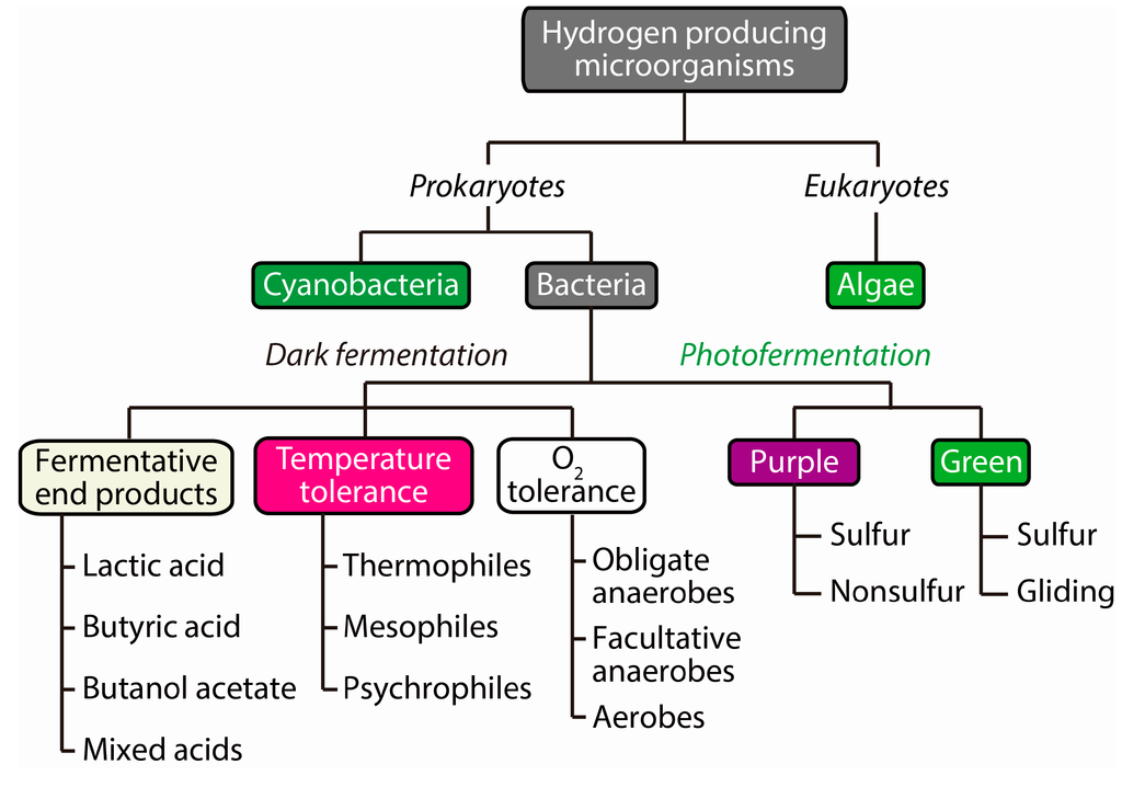 In nature, a variety of organisms including the archaea, anaerobic and facultative aerobic bacteria, cyanobacteria, and lower eukaryotes (i.e., green algae and protists) produce H2 [12,13], which may function singly or as a consortium of similar types or mixed cultures (Figure 2). The major H2 producing biocatalysts are typical heterotrophs in the fermentation process. Some dark fermentative bacteria do not require solar energy as an energy source and tolerate O2 deficient conditions; these microorganisms are obligate anaerobes, which are further classified based on their sensitivity to O2 and their growth temperature (Figure 2).