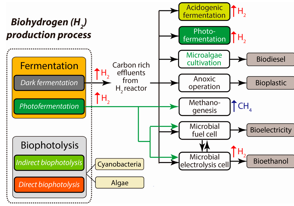 Schematic representation of the primary biological routes integrated with various secondary processes for effective H2 production.