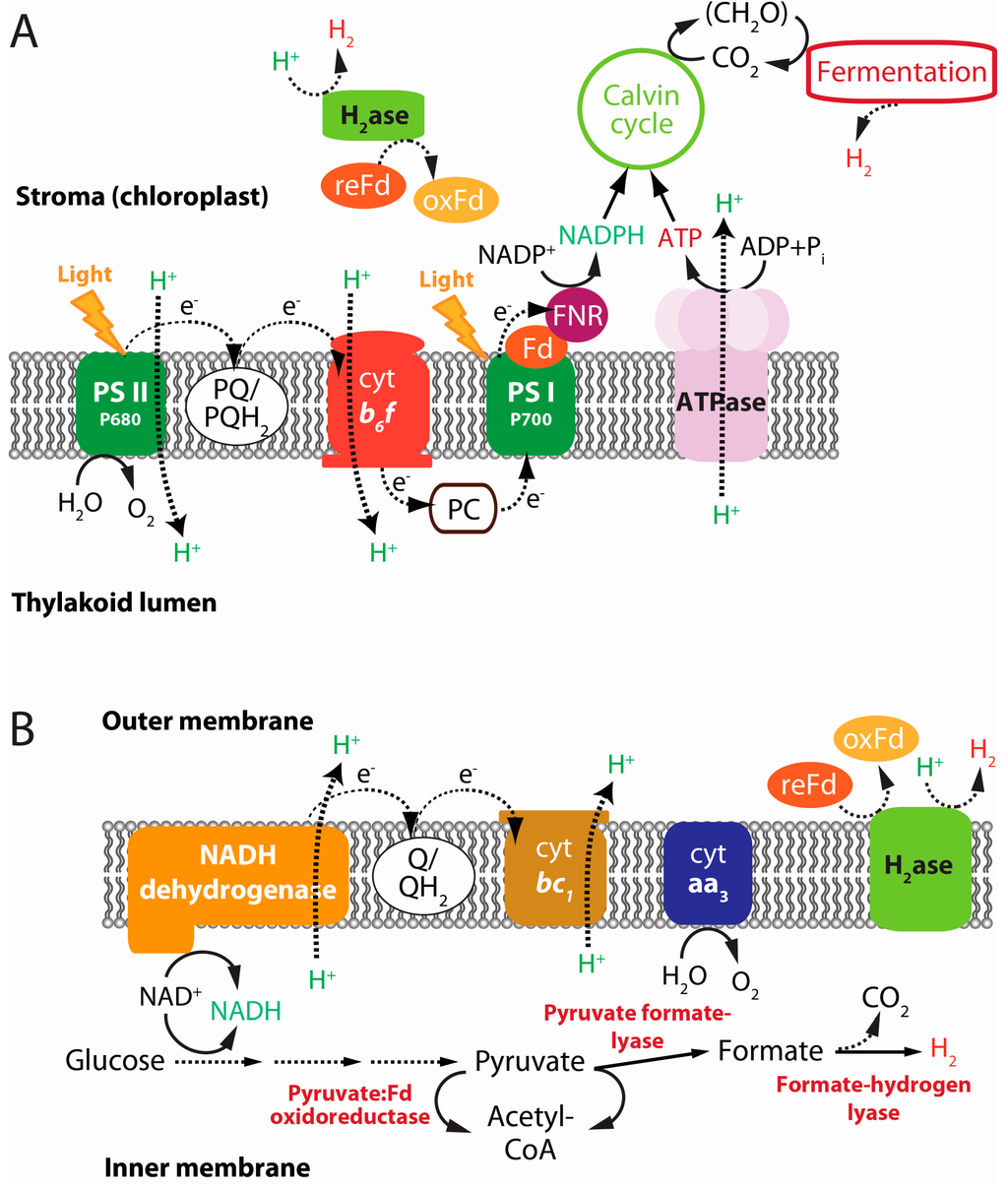 Schematic illustration of H2 evolution through (A) direct/indirect biophotolysis and (B) dark fermentation: (A) PS II, photosystem II; PQ, plastoquinone; PQH2, plastoquinol; cyt b6f, cytochrome b6f complex; PC, plastocyanin; PS I, photosystem I; Fd, ferredoxin; and FNR, ferredoxin-NADP+ reductase. Approximately half of the evolved H2 is from water splitting, and the rest of the H2 is produced with e− made from the fixed carbon by the activity of the PS I; (B) Q, quinone; QH2, quinol; cyt bc1, cytochrome bc1 complex; and cyt aa3, the cytochrome aa3 oxidase.
