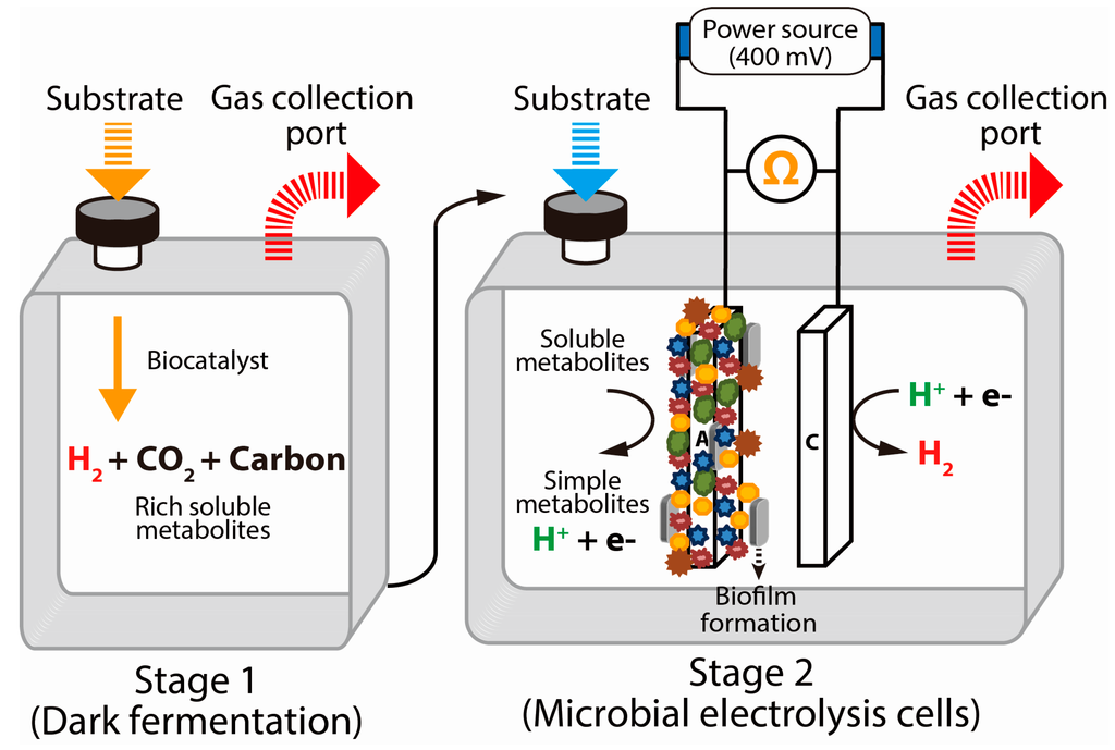 Recently, many integrated approaches were proposed to overcome the limitations of several processes to increase the production of H2 in dark fermentation. The use of the residual acid-rich organic substances from the fermentation effluents as carbon-rich substrates for further energy recovery is a viable and novel idea, particularly when in the form of an integrated two-stage energy producing process (Table 2 and Figure 3). Numerous secondary processes, including methanogenesis for methane, acidogenic fermentation for H2, photobiological processes for H2 [90,91,92], MECs for H2 [44], anoxygenic nutrient-limiting processes for bioplastics, cultivation of heterotrophic algae for lipids, and MFCs for bioelectricity generation, were integrated with the primary dark fermentative process of H2 production. With these integrated approaches, the primary process uses these further substrates for additional energy production, and therefore, the entire process is more economically viable and practically applicable than without the integration.