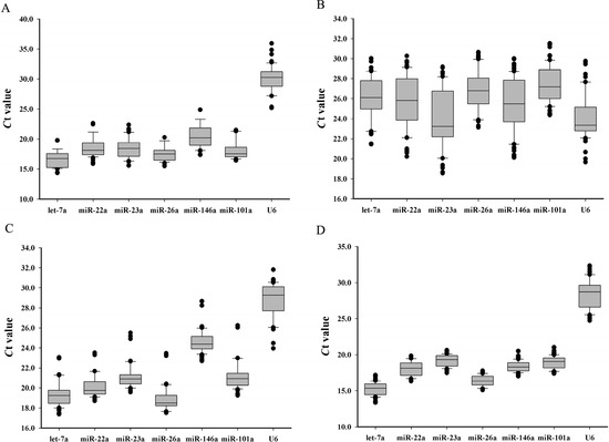 | Normfinder | miR-23a | let-7a | miR-26a | miR-146a | miR-22a | miR-101a | U6 |