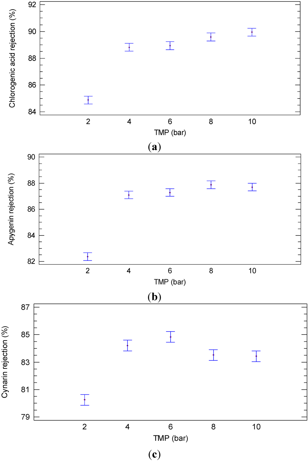 Figure 1 shows the rejection of the NP030 membrane towards chlorogenic acid, cynarin and apygenin in the range of TMP values of 2–10 bar. The rejection towards chlorogenic acid shows a significant difference (p = 0.000; F-ratio = 119.31) at different TMP values. The minimum rejection was observed at 2 bar, whereas the maximum rejection was obtained at 10 bar. It was appreciated that there is no significant difference in the rejection between 4 and 6 bar as well as between 8 and 10 bar (Figure 1a). Similar results were obtained for apygenin where significant differences (p = 0.000; F-ratio = 155.20) were observed in the rejection at different TMP values. The minimum rejection was obtained at 2 bar and the maximum one at 8 bar. According to LSD analysis there are no significant differences between 4–6 and 8–10 bar (Figure 1b). On the other hand, significant differences (p = 0.000; F-ratio = 51.66) were found in the rejection of cynarin at the TMP values investigated. In this case, the minimum rejection was found at 2 bar such as for chlorogenic acid and apygenin; however the maximum rejection was at 4–6 bar (Figure 1c).