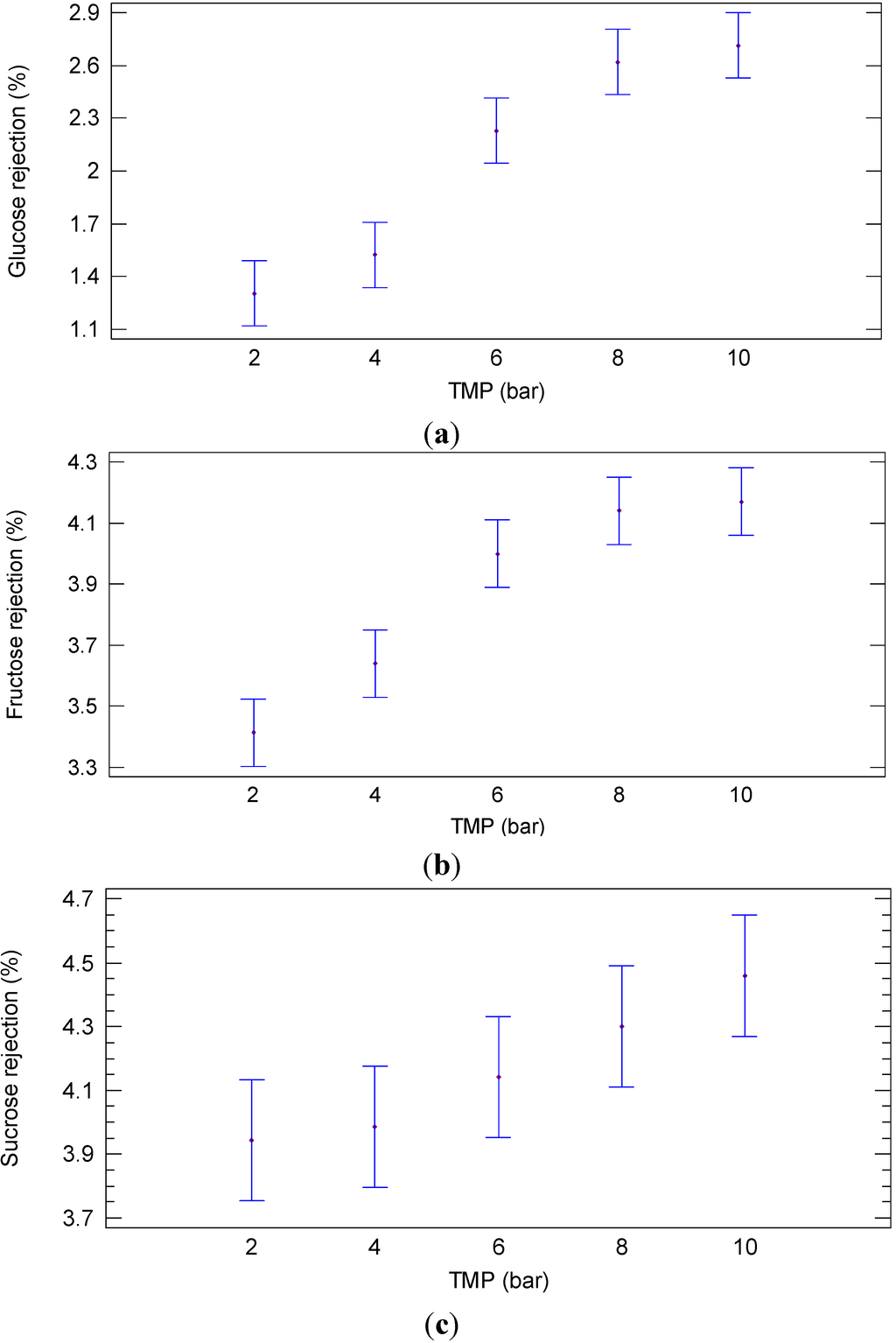 Least significant difference (LSD) plot showing the effect of TMP on the rejection of (a) glucose (b) fructose and (c) sucrose (NP030 membrane, total recycle configuration, 25 °C).