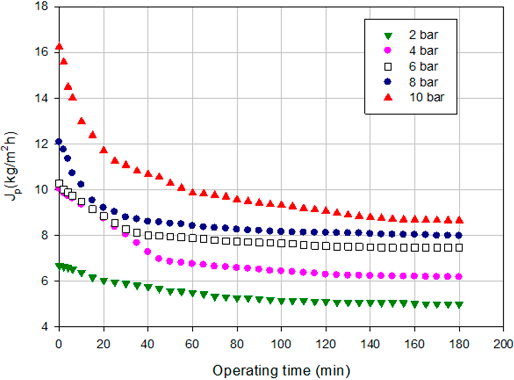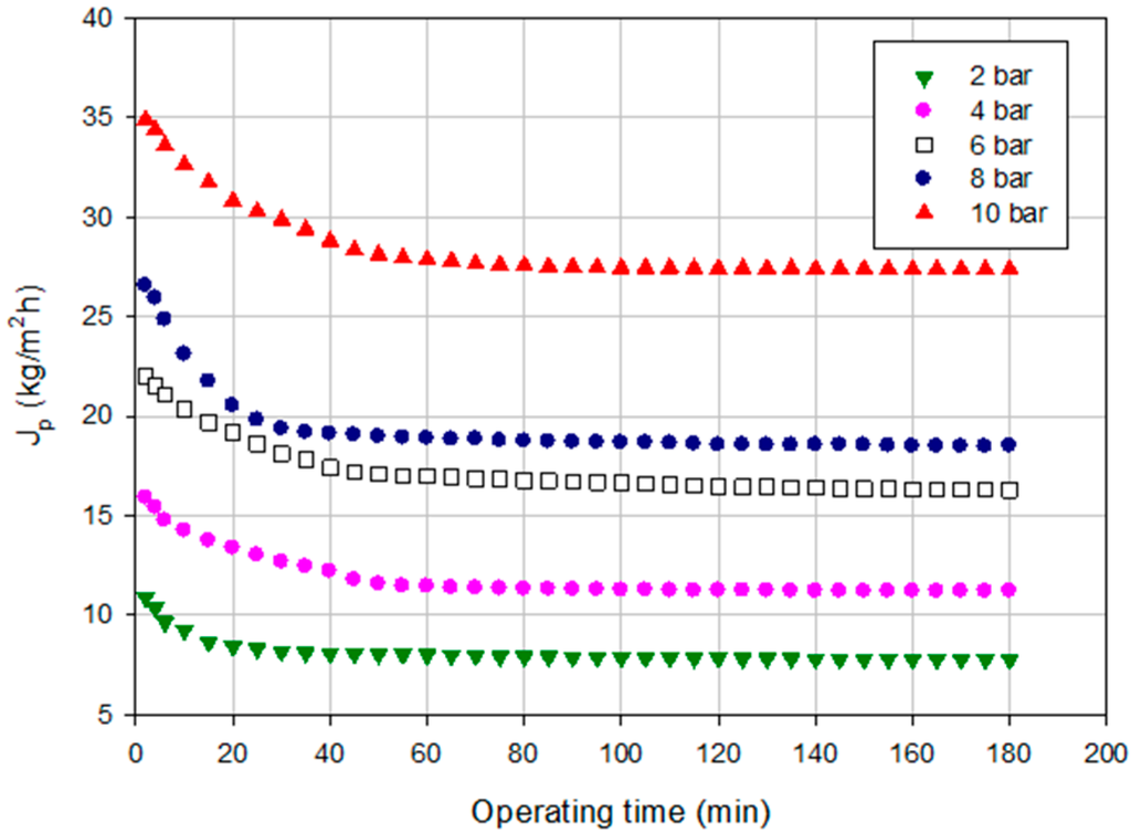 Figure 3 shows the time evolution of the permeate flux in the investigated range of operating pressures. The increase in TMP produced an increasing in the permeate flux; in addition, the flux decay increased by increasing the TMP. In particular, at 10 bar, the drop in the permeate flux was of 46% when compared with the membrane performance at 2 bar where the drop in the permeate flux was of 25%. This behavior can be attributed to the concentration polarization and membrane fouling produced on the membrane surface [30].