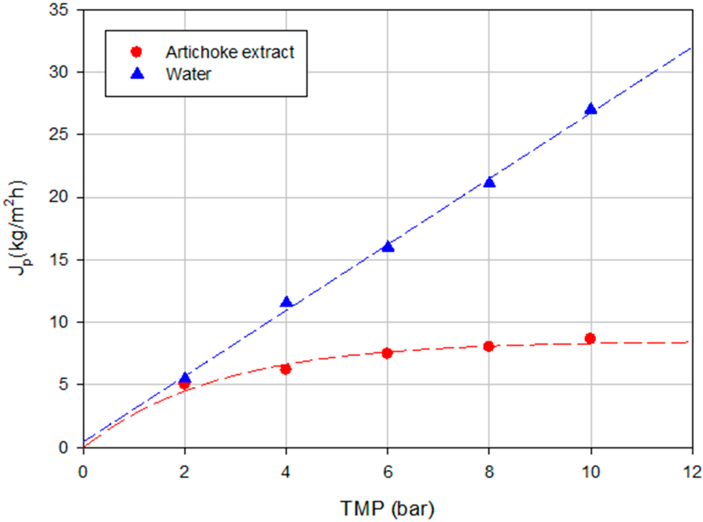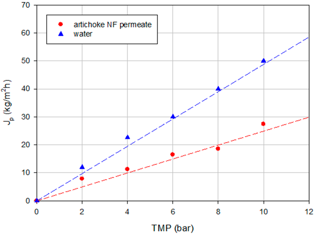 The effect of TMP on the rejection towards sugars as well as the behavior of permeate flux at different TMP was studied. Figure 9 shows the time evolution of the permeate flux at different TMP values according to a total recycle configuration for the Desal DK membrane. Significant differences (p = 0.0000; F-ratio = 868.77) were found between the permeate flux values within the operating pressures investigated. Figure 10 shows the relationship between TMP and steady-state permeate flux for the artichoke extract and water. In both cases a linear trend can be observed. The difference between the permeate fluxes of water and artichoke extract shows the amount of fouling in the process under the same conditions of temperature and pressure. A linear trend between permeate flux and pressure was also observed by Mello et al. [38] in the concentration of phenolic compounds in aqueous and ethanolic propolis extracts through a NF membrane. According to Bacchin et al. [32] this behavior represents a presence of not complete adsorption and possible mass deposition by convection. In our case, a critical flux is not reached at all and also at the maximum TMP investigated the linearity between TMP and permeate flux is maintained. Therefore, operating at 10 bar it will be possible to obtain permeate flux values below the region where the fouling becomes irreversible.