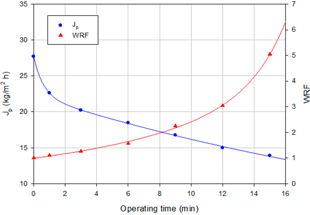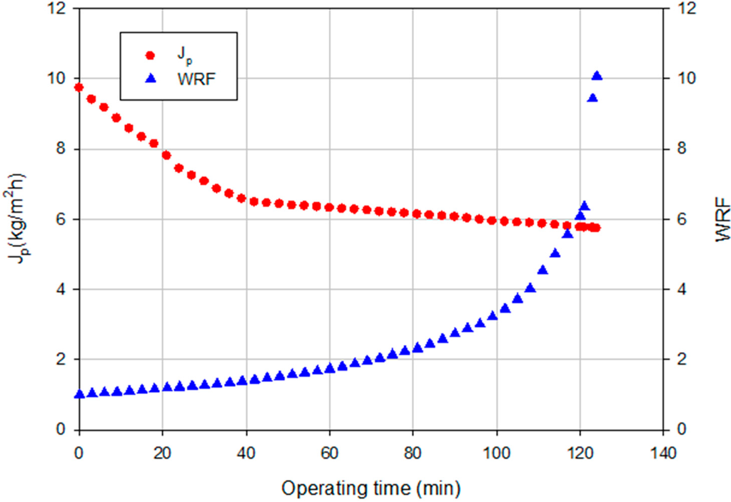 Experimental runs according to the batch concentration configuration were performed in optimal operating conditions on the basis of the results obtained under a total recycle configuration. Figure 11 shows the time evolution of the permeate flux and WRF when the NF process was operated at a TMP of 10 bar and a temperature of 25 °C up to a final WRF of 5. In this case, the reduction of permeate flux was equal to 49.83% achieving a pseudo-stable permeate flux of 13.89 kg/m2·h.