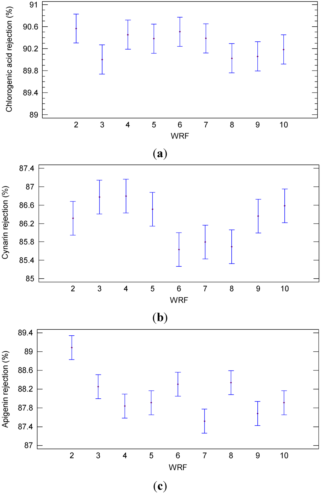 In these conditions, the rejection towards chlorogenic acid, cynarin and apigenin was higher than 85% independently of the achieved WRF as shown in Figure 6. In particular, the rejection towards chlorogenic acid did not show significant differences (p = 0.2202; F-ratio = 1.52) at WRF from 2 to 10 (Figure 6a). On the other hand, significant differences (p = 0.144; F-ratio = 3.42) were observed for the cynarin rejection at different WRF (Figure 6b). The same behavior was observed for apigenin where the rejection showed significant differences (p = 0.002; F-ratio = 7.41) from WRF 2 to 10 (Figure 6c).