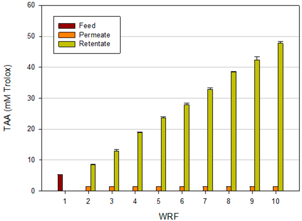 The increased concentration of phenolic compounds in the retentate was accompanied by an increasing of the total antioxidant activity (TAA) stream as reported in Figure 7. In particular, the ABTS radical scavenging capacity of retentates was increased by 9 times in comparison with the initial feed. Similar results were obtained in the concentration of phenolic compounds from mate bark aqueous extracts [33] and from ethanolic extracts of Sideritis ssp. (an endemic plant of the Balkan Peninsula) [34] by NF membranes. At the same time, the TAA of the permeate remained low and unchanged in the permeate stream. These results confirmed the strict correlation between total phenolic content and antiradical activity widely reported in literature [35,36,37].