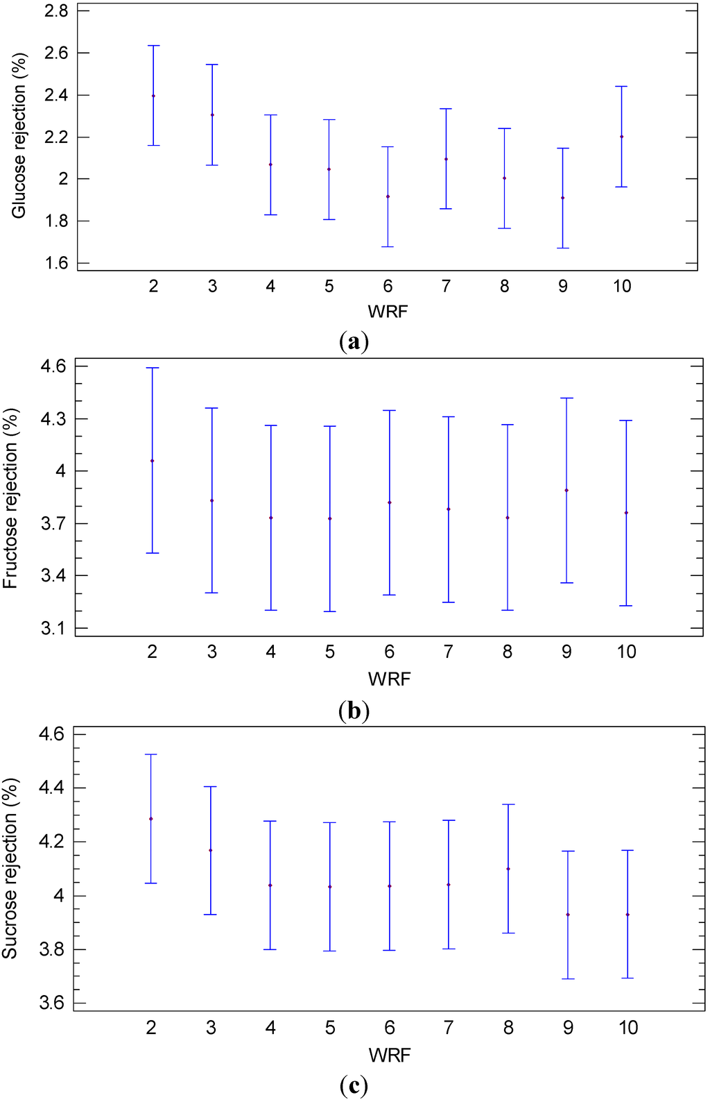 Least significant difference (LSD) plot showing the effect of WRF on the rejection of (a) glucose (b) fructose and (c) sucrose (NP030 membrane, batch concentration configuration, 4 bar, 25 °C).