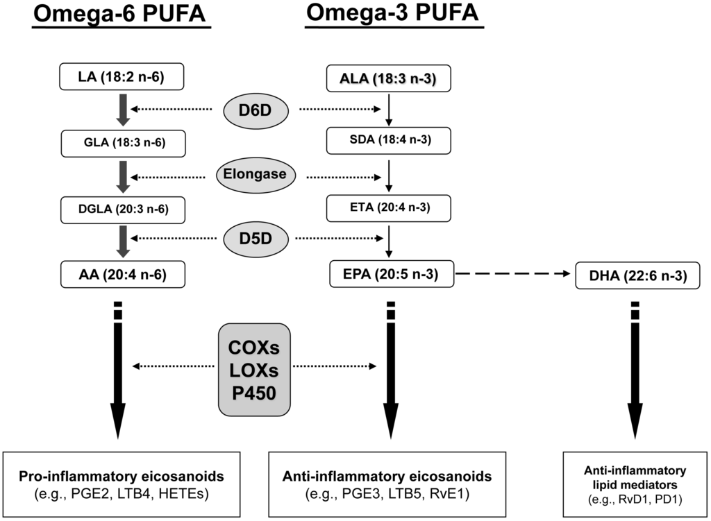 Diagram of the metabolic pathways for n-6 and n-3 polyunsaturated fatty acids (PUFA). Omega-6 linoleic acid (LA) and n-3 α-linolenic acid (ALA) cannot be synthesized by mammalian cells and must be obtained through the diet. They can be further elongated and desaturated by δ-6-desaturase (D6D), elongase, and D5D to form n-6 arachidonic acid (AA) and n-3 eicosapentaenoic acid (EPA), respectively. AA and EPA can then be converted by cyclooxygenases (COX), lipooxygenases (LOX), and cytochrome P450 (CYP 450) into pro- and anti-inflammatory eicosanoids, including prostaglandins (PG), leukotrienes (LT), thromboxanes (TX), hydroxyeicosatraenoic acids (HETE), and resolvins (Rv). The n-3 docosahexaenoic acid (DHA) can be converted into Rvs and protectins (PD).