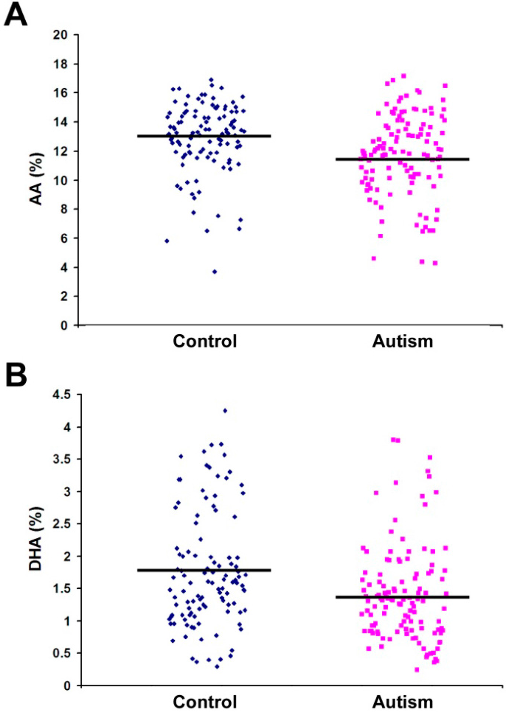 Scatterplot showing the distribution of fatty acid percentages of AA (A); docosahexaenoic acid (DHA) (B); and total PUFA (C) between control and autism groups. Phospholipids were extracted from red blood cell (RBC) samples of control subjects (n = 110) and autism patients (n = 121) and analyzed by gas chromatography. Bars represent the mean values (refer to Table 1 for significance).