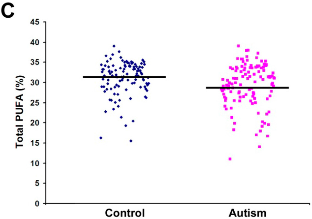 Differences in fatty acid composition between autistic patients and unaffected individuals.