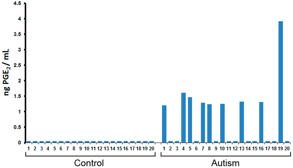 PGE2 is a major metabolite of AA and is also a key inflammatory eicosanoid. To test our hypothesis that autistic individuals may exhibit higher levels of PGE2, we used LC/MS to quantify the plasma PGE2 levels for autistic individuals (n = 20) and controls (n = 20) (Figure 3). All control samples were under the detection limit for PGE2 detection of <0.71 ng/mL. In contrast, PGE2 levels were detected in 9 of the 20 plasma samples from autistic individuals, ranging from 1.21 to 3.91 ng/mL, indicating a marked difference in plasma PGE2 levels between autistic individuals and control subjects.