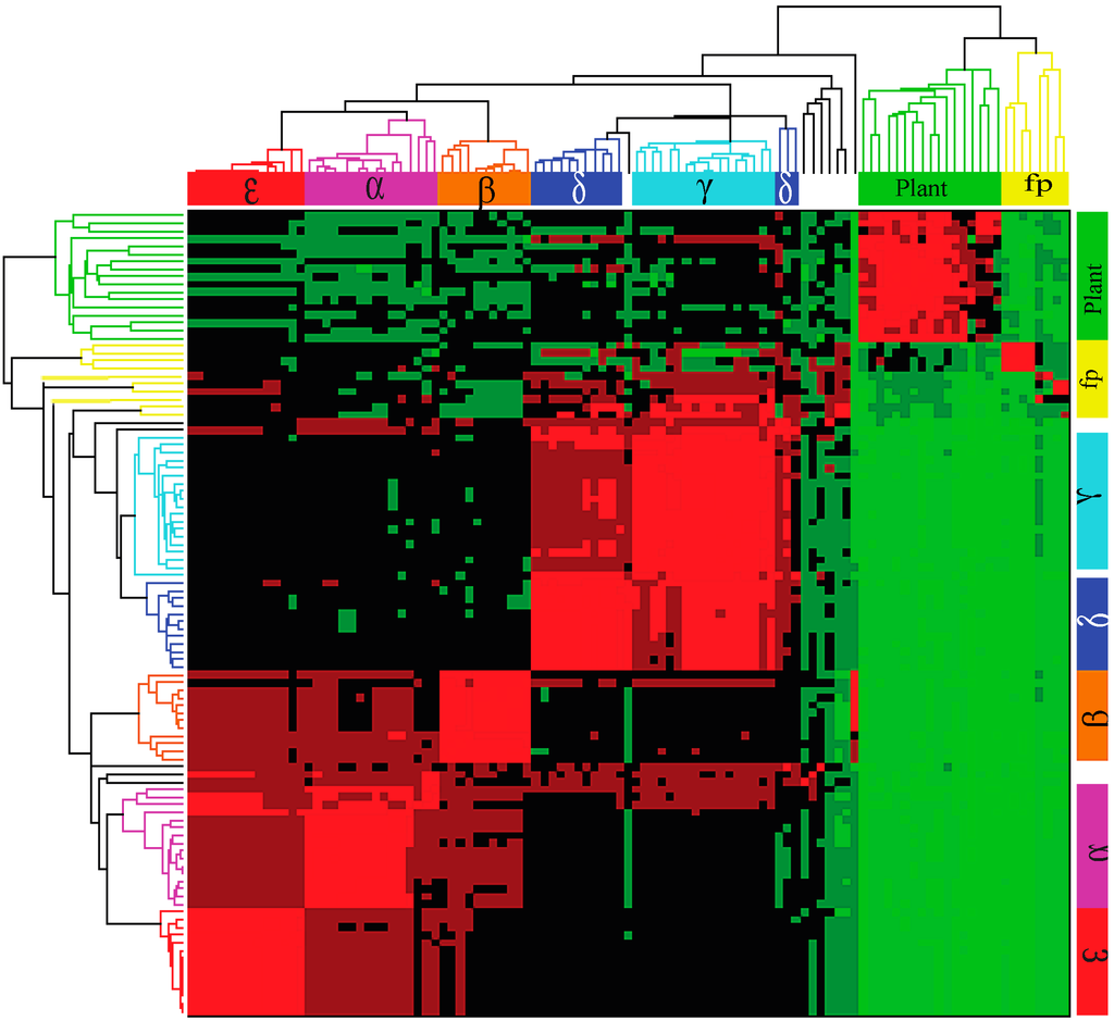 A hierarchical clustering was undertaken to gain insight into the relationship among the 105 B56 genes from animal, fungal, protist, and plant species. This analysis is based on sequence identity obtained through BLAST hits. The identity matrix was populated with the percent identity values, where rows correspond to the queries of the 105 genes, and columns correspond to the target database of the 105 genes. The identity matrix was then visualized using hierarchical clustering (Figure 1). The dendrograms and heat maps clearly delineate separate gene clusters for animal and plant B56 genes, with the animal cluster further subdivided into two clusters, B56αβε and B56γδ. Within the animal B56 genes, the B56αβε cluster has clearly grouped into its three isoforms and the B56γδ cluster has segregated into its two isoforms. The increased heterogeneity in the B56αβε cluster may suggest that the duplicate copies were retained because they acquired novel functions. The plant B56 genes do not segregate into distinct families, suggesting that plant B56 family genes underwent duplication later than in animal lineages. However, we only examined three plant species, and a broader analysis may reveal additional information. Species possessing a single B56 gene of each B56 subfamily (Amphimedon queenslandica, Hydra vulgaris, Drosophila melanogaster, Caenorhabditis elegans, and Strongylocentrotus purpuratus) generally fall in line with either the B56αβε or B56γδ subfamilies. Although this data visualization clearly delineates B56 subfamilies and suggests relationships between the B56 genes, it provides only an overview of B56 gene family divergence and evolution. A phylogenetic analysis was performed to trace the diversification of the B56 family.