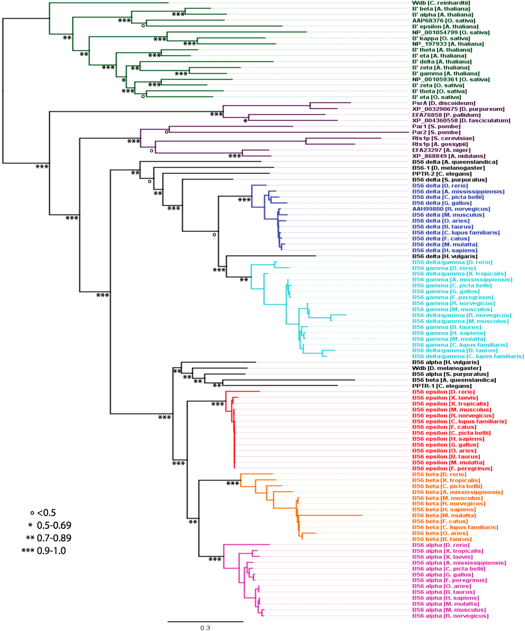 B56 phylogenetic tree. A B56 phylogenetic tree was built using FastTree 2. A B56 sequence was used in this analysis only if it contained 90% or more of the conserved core domain. Horizontal lines are proportional to the substitution rate. The bar represents 0.3 changes per amino acid. Local support values are marked with ***, **, *, and o for 0.9–1.0, 0.7–0.89, 0.5–0.69, and <0.5, respectively.
