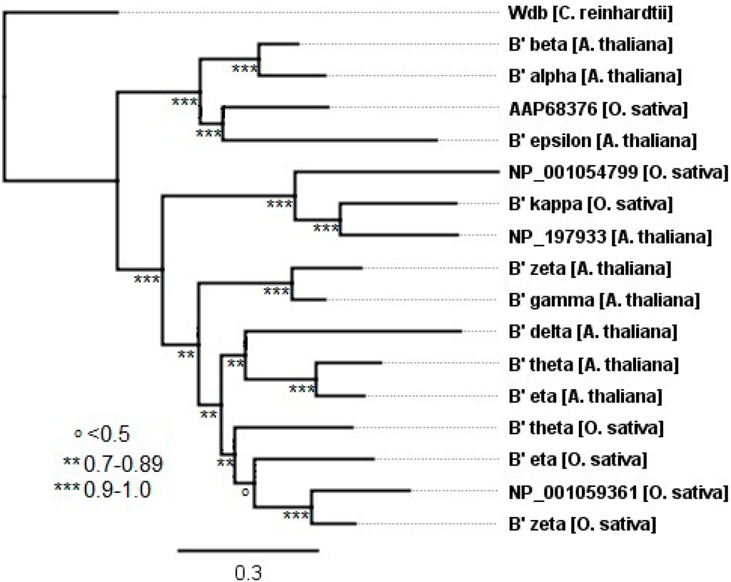 The evolution of B56 genes in plants. A plant B' phylogenetic tree was built using FastTree 2. The tree was rooted with C. reinhardtii wdb. Horizontal lines are proportional to the substitution rate. The bar represents 0.3 changes per amino acid. Local support values are marked with ***, **, and o for 0.9–1.0, 0.7–0.89, and <0.5, respectively.