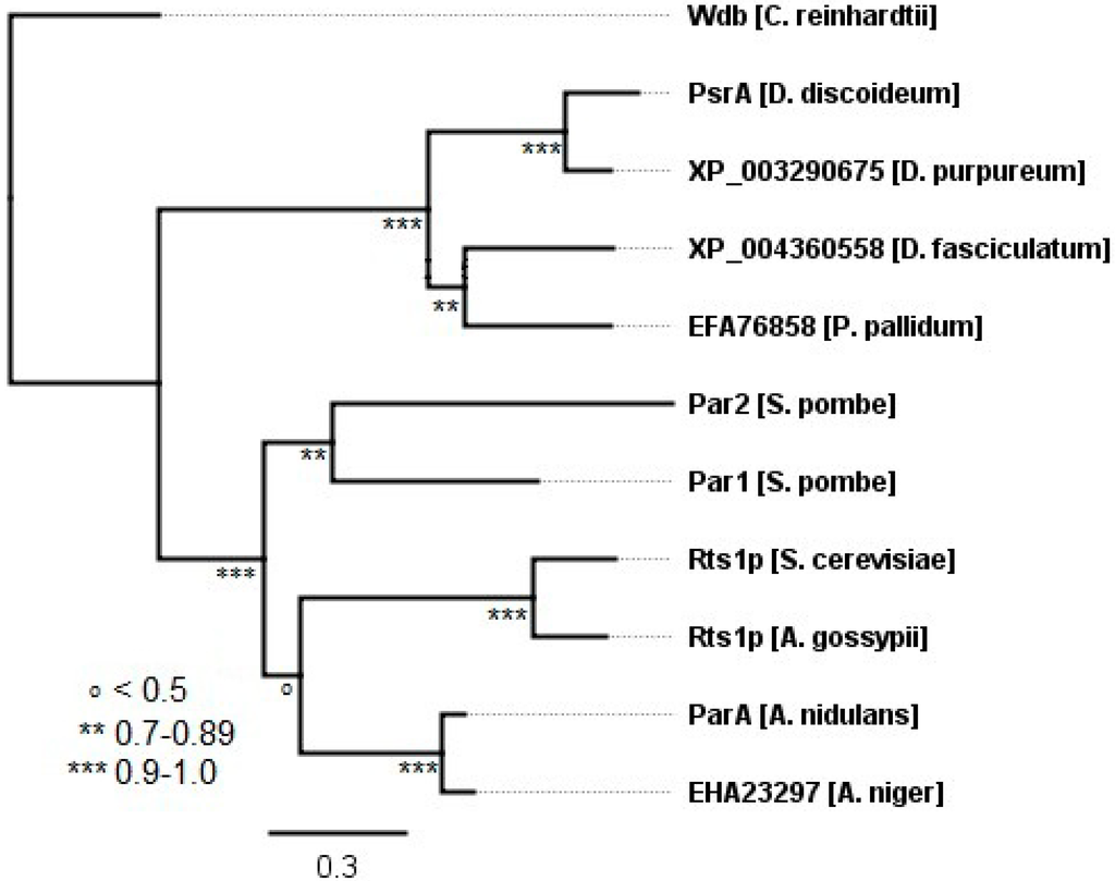 The evolution of B56 genes in fungi and protists. A B56 protist and fungal phylogenetic tree was built using FastTree 2. Each tree was rooted with C. reinhardtii wdb. Horizontal lines are proportional to the substitution rate. The bar represents 0.3 changes per amino acid. Local support values are marked with ***, **, and o for 0.9–1.0, 0.7–0.89, and <0.5, respectively.