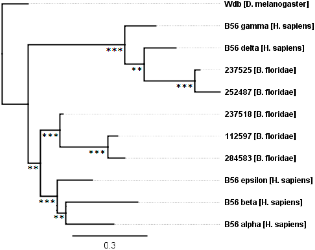 The evolution of B56 genes in the simple chordate B. floridae. B. floridae B56 isoforms have diverged into B56αβε and B56γδ subfamilies. The tree was rooted with D. melanogaster wdb. Horizontal lines are proportional to the substitution rate. The bar represents 0.3 changes per amino acid. Local support values are marked with *** and ** for 0.9–1.0 and 0.7–0.89.