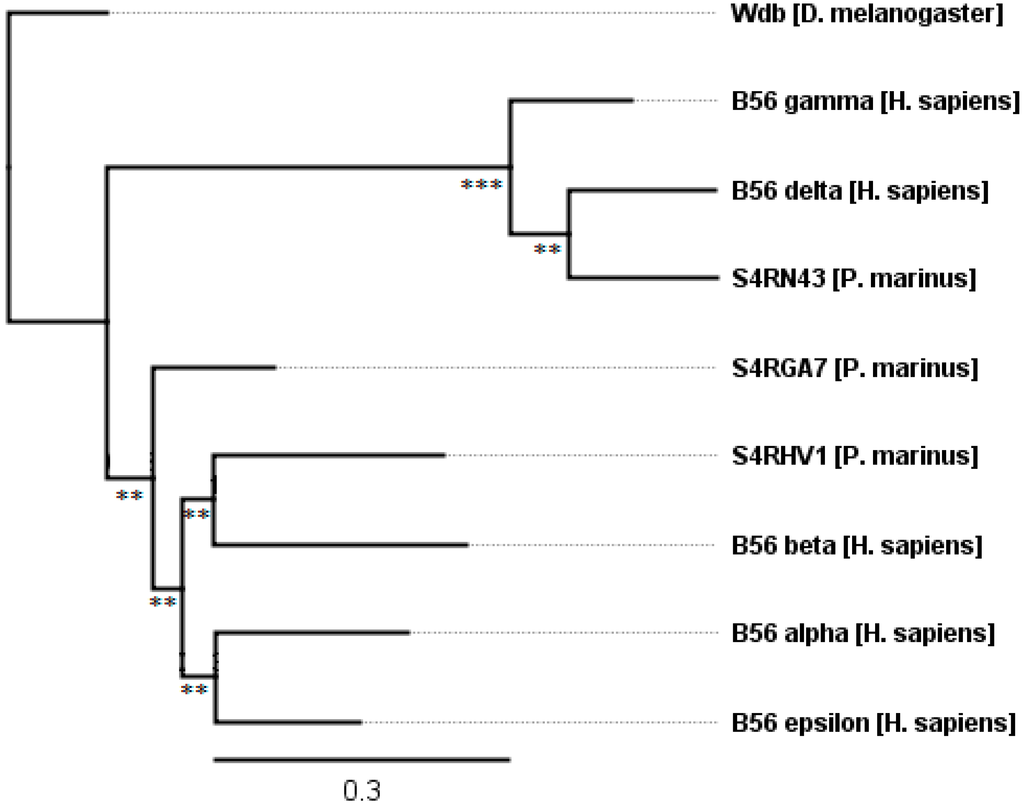 The evolution of B56 genes in the simple chordate P. marinus. One P. marinus B56 family member remains undifferentiated in the B56αβε subfamily while two correspond to the vertebrate isoforms B56α and B56δ. The tree was rooted with D. melanogaster wdb. Horizontal lines are proportional to the substitution rate. The bar represents 0.3 changes per amino acid. Local support values are marked with *** and ** for 0.9–1.0 and 0.7–0.89.