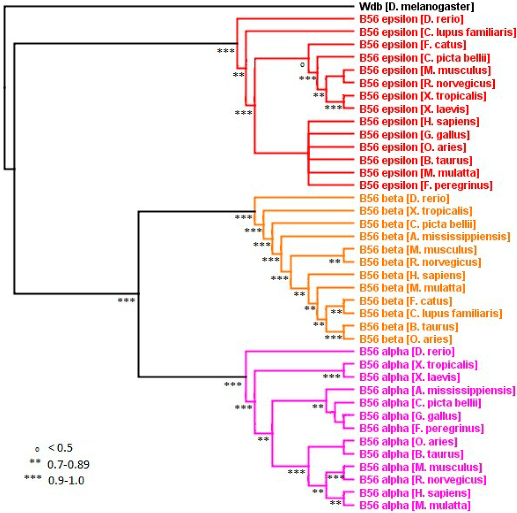 Vertebrate B56αβε phylogenetic tree. A B56αβε phylogenetic tree was built using FastTree 2. The tree was rooted with D. melanogaster wdb. Horizontal lines are not proportional to the substitution rate in order to display the clade topology. Local support values are marked with ***, **, and o for 0.9–1.0, 0.7–0.89, and <0.5, respectively.