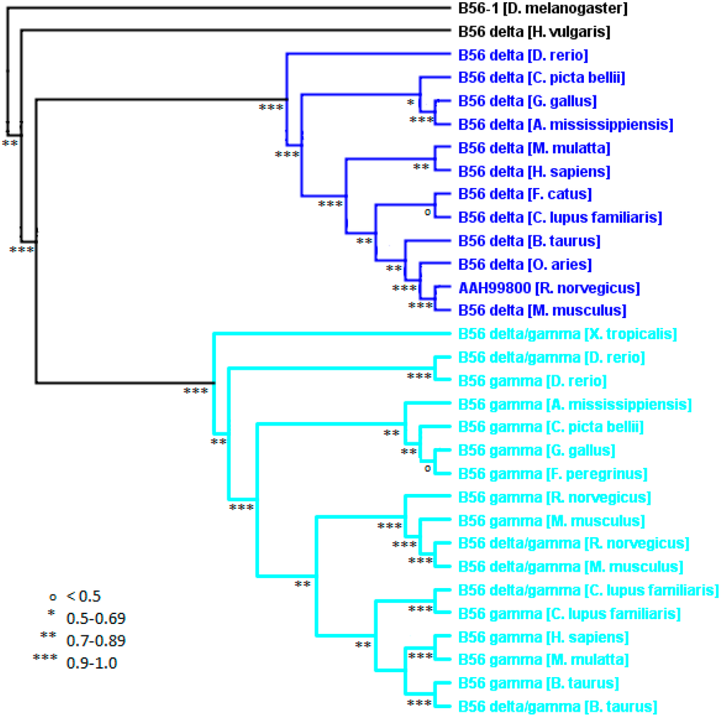 Vertebrate B56γδ phylogenetic tree. A B56γδ phylogenetic tree was built using FastTree 2. The tree was rooted with D. melanogaster B56-1. Horizontal lines are not proportional to the substitution rate in order to display the clade topology. Local support values are marked with ***, **, * and o for 0.9–1.0, 0.7–0.89, 0.5–0.69, and <0.5, respectively.
