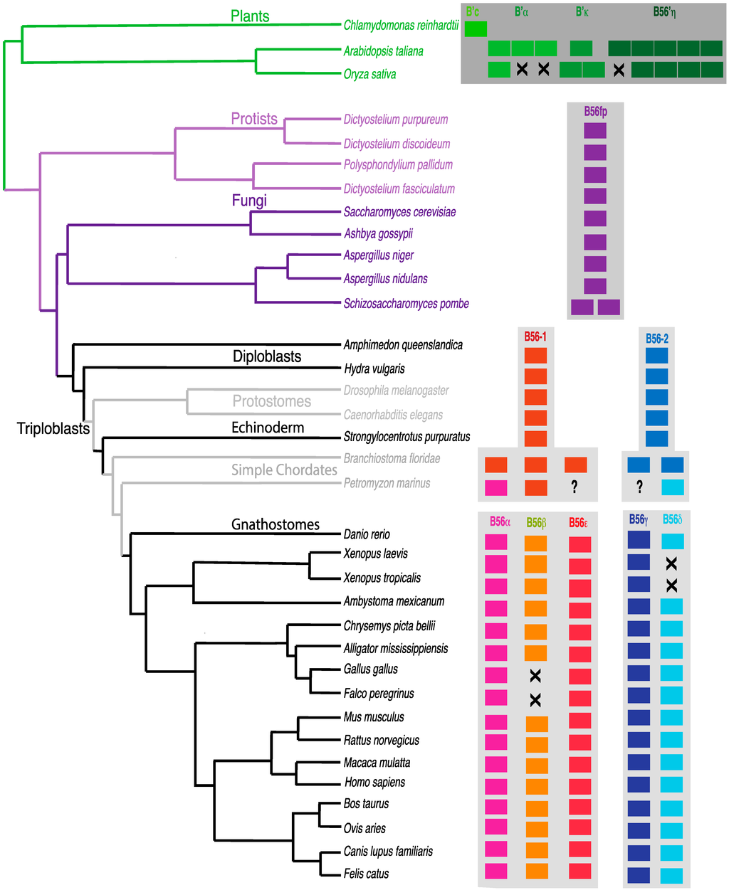 Distribution of B56 genes in plants, protists, fungi, and animals. A species tree was constructed based on the Tree of Life [25]. B56 genes are represented by rectangles; the absence of a B56 gene is signified with an X; uncertainty in the presence of a B56 isoform is signified by a question mark.