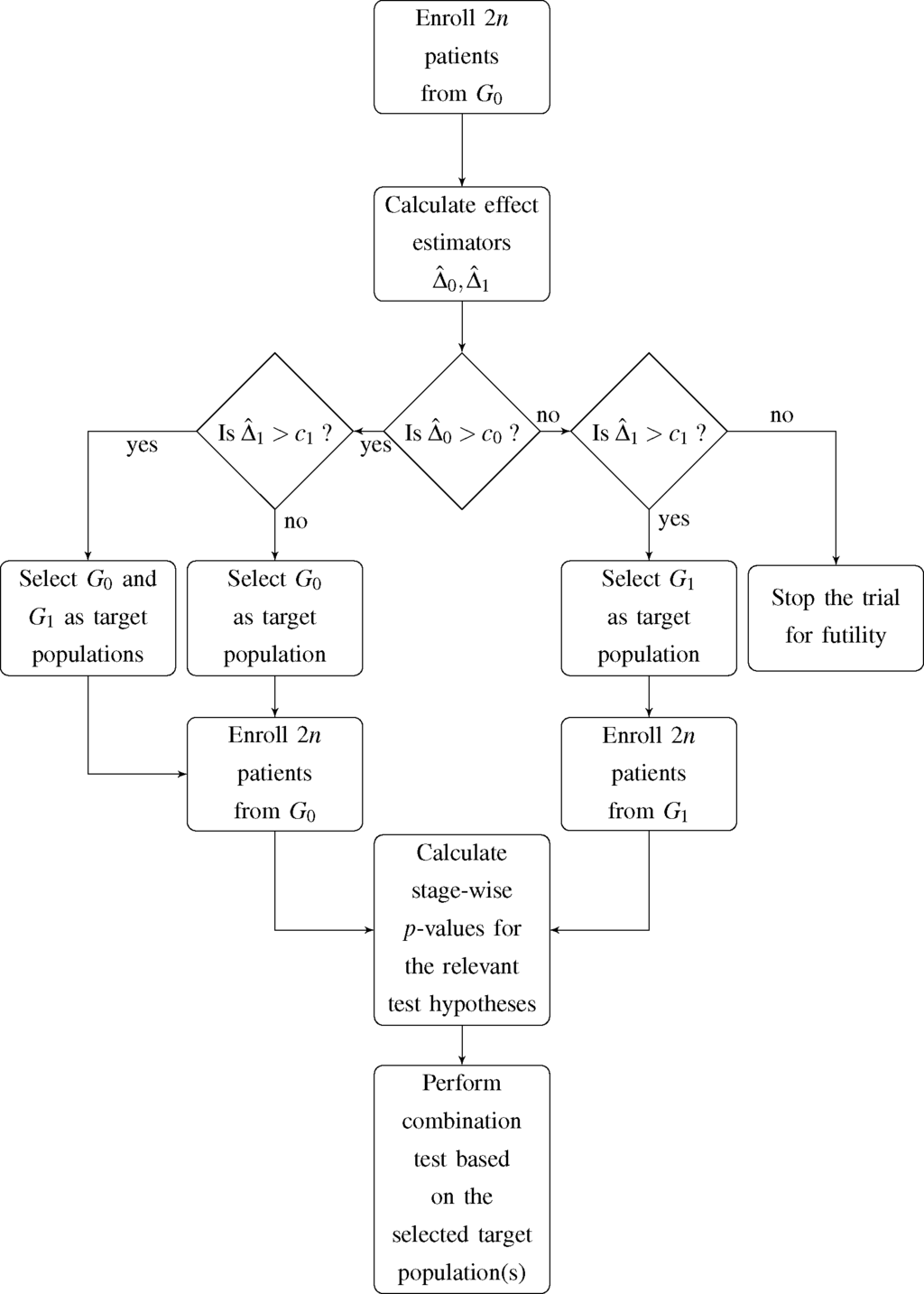 , does not exceed the pre-specified decision threshold ci, i = 0,1, the respective population is dropped as a target population for the second stage of the trial. A flowchart of the proposed trial design is shown in Figure 1.