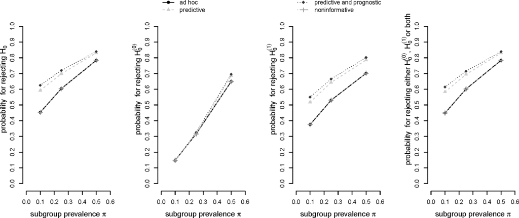 The advantage of decision rules (b) and (c) over rules (a) and (d) may be explained by the fact that they favor the selection of the subgroup for all three prevalence scenarios due to their rather generous decision threshold c1. Furthermore, the decision thresholds for the total population c0 are also slightly more generous as compared to rules (a) and (d) for an increasing subgroup prevalence which, accordingly, yields to an advantage in power.